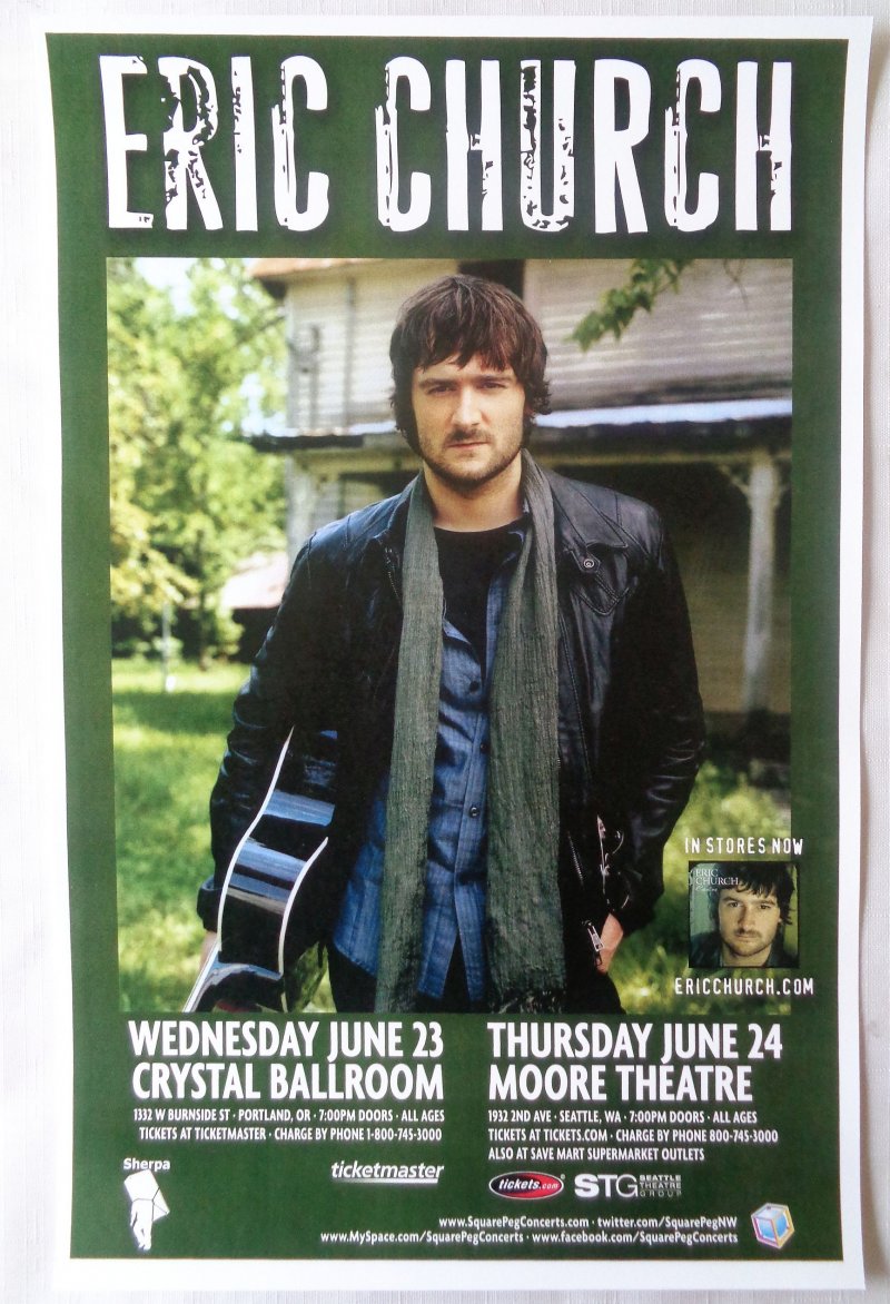 This ERIC CHURCH gig poster is rare. It is very hard-to-find since it was a promo only available at ticket outlets and music stores to promote a pair of his 2010 concerts.